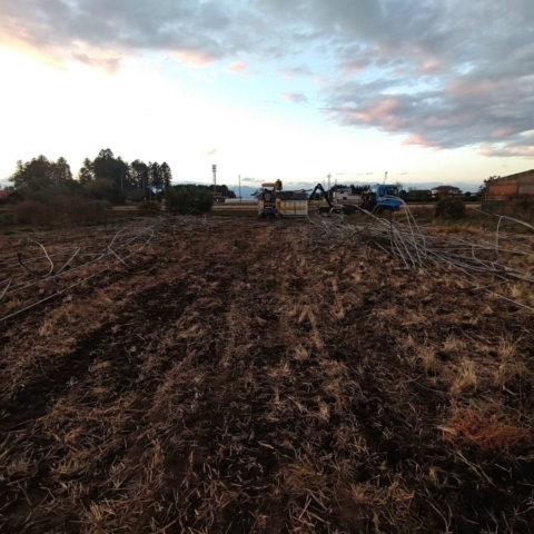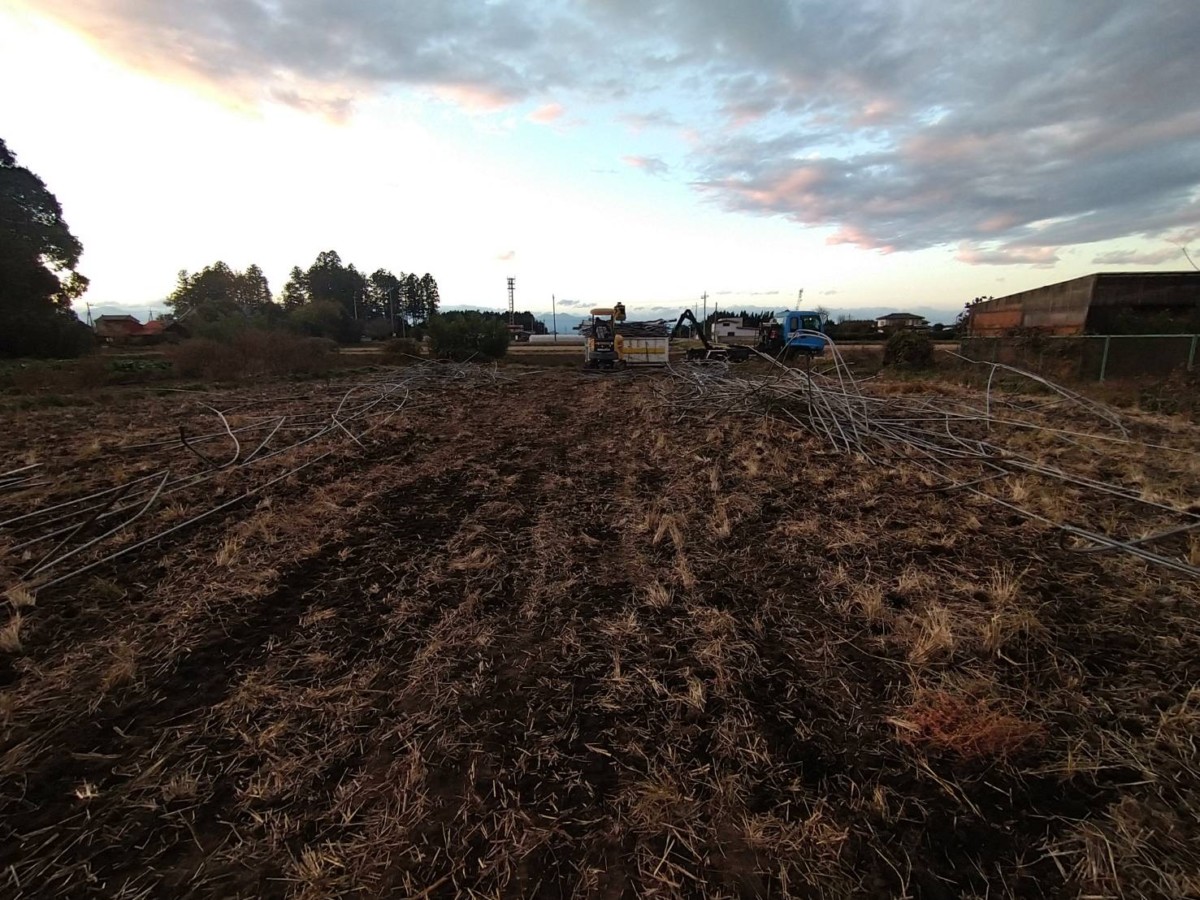 重機でビニールハウスの鉄柱を引き抜きながら丁寧にバラしていき、最後に鉄屑を拾い集めて作業を完了しました。