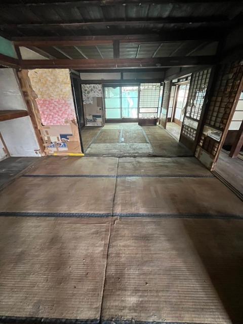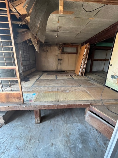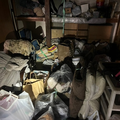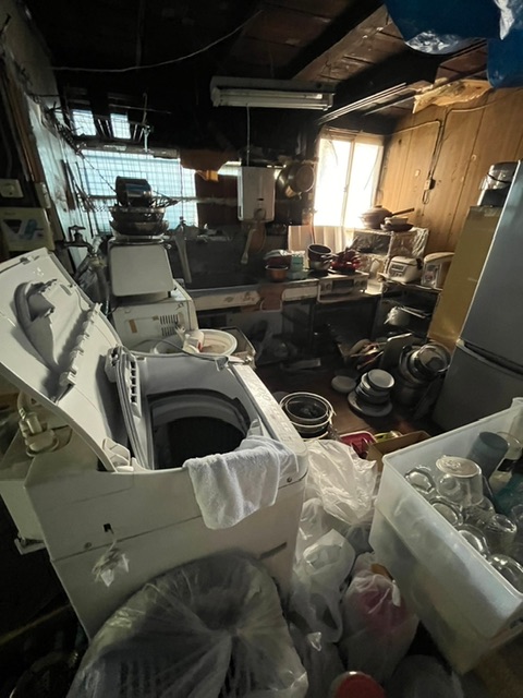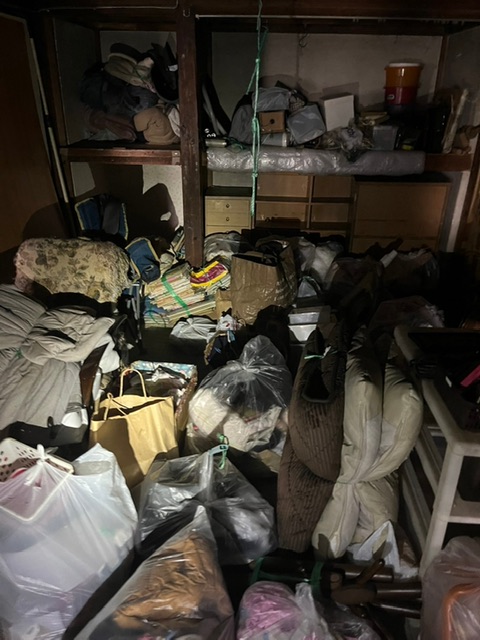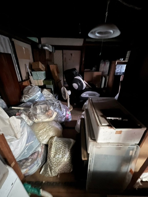 部屋は12畳以上の部屋が複数あり、かなりの荷物量だったので、しっかりと仕分けしたうえで廃棄しております。作業を進める中で、畳や床が腐っていてブカブカになっている箇所も多かったので、踏み外さないように注意しながらの片付け作業になりました。