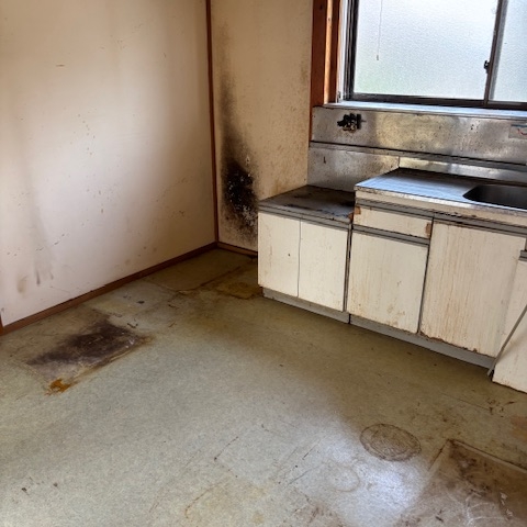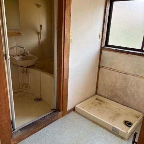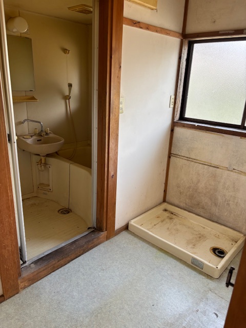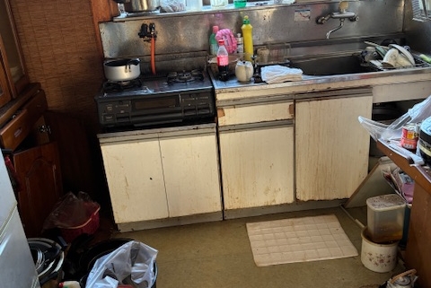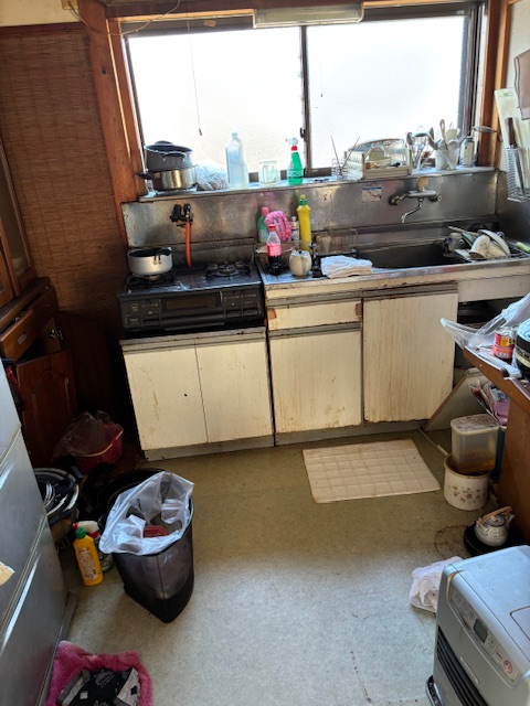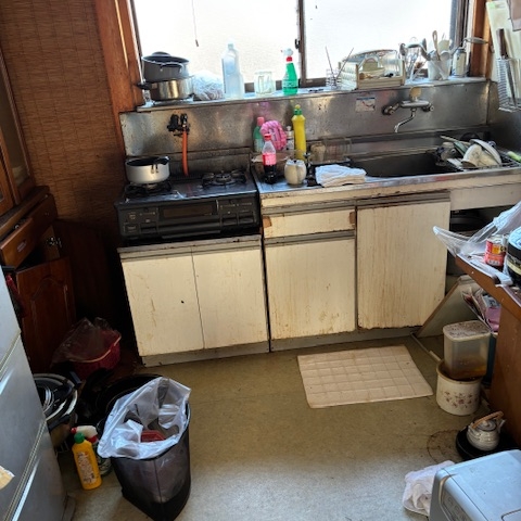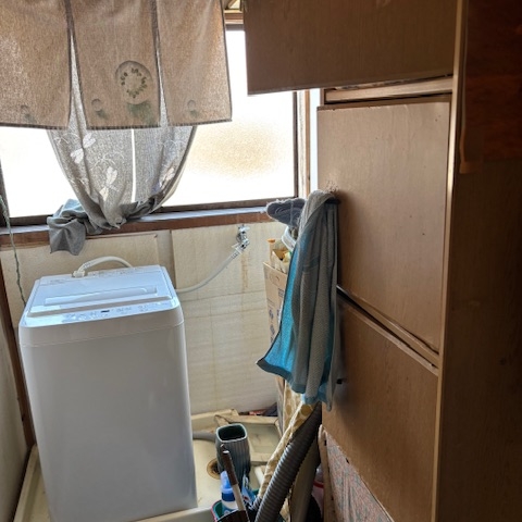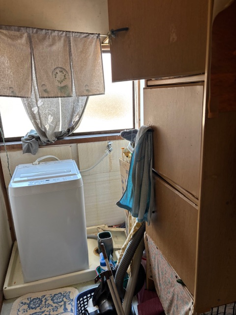 キッチンには調理器具や食品残り、洗面所には洗濯機や掃除道具が置かれており、水回りも重点的に対応。排水口や給水周辺の汚れも落とし、退去後のクリーニングがスムーズに進むよう整えました。