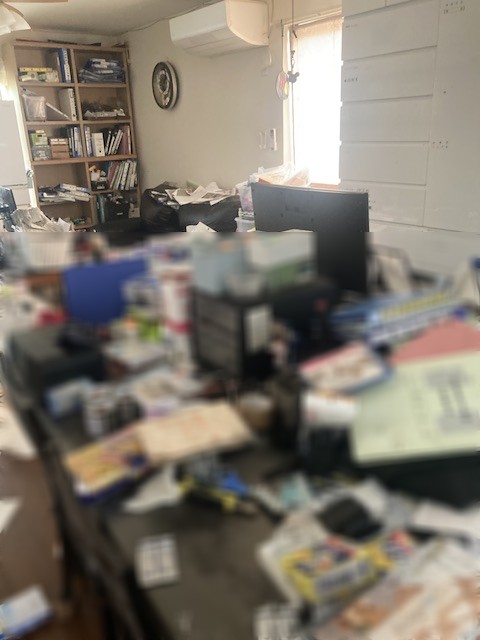 LDKには日用品や紙類、食品パッケージなどがテーブル・床に散乱し、生活導線がふさがれた状態でした。