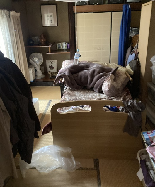ベッド周りには寝具や雑貨類が山積みとなっており、生活動線がふさがれていました。