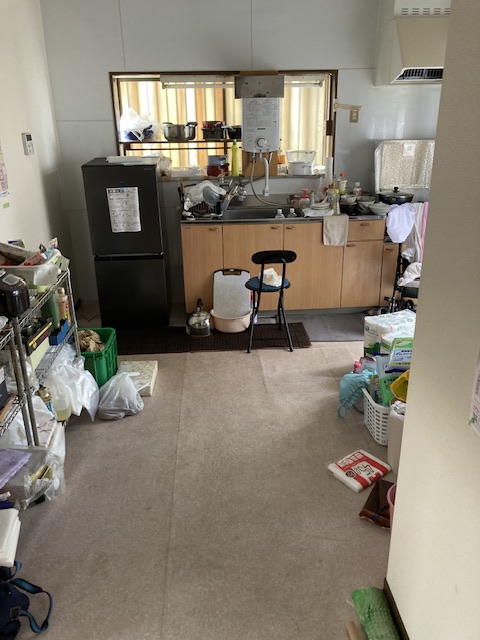 3DKのうち、キッチンや寝室には日用品・調理器具・衣類などが長年蓄積しており、床が見えない状態の箇所も。