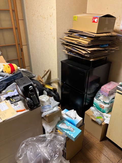 現場となった1DKの室内には、日用品や生活ゴミ、段ボール、衣類、家電製品などが点在していましたが、お客様の事前整理によって、大まかな分別が済んでおり、スムーズに作業を進めることができました。
