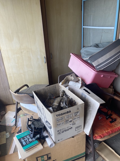 押し入れや本棚、収納棚には昭和〜平成初期の生活雑貨がそのままの形で残されており、ひとつひとつ仕分けが必要な現場でした。