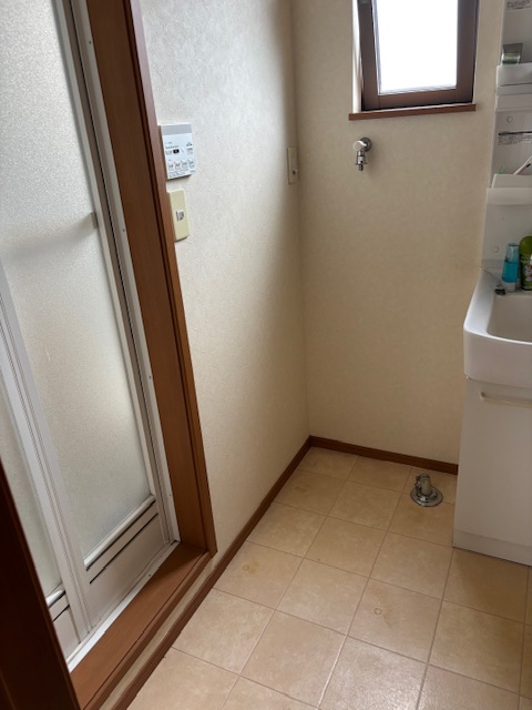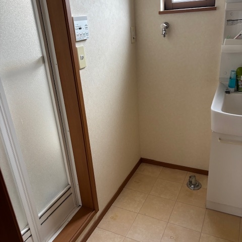 洗濯機まわりに設置されていた洗濯台や収納棚もすべて解体・搬出。空間がすっきりした状態となり、入居前の状態に近づけました。