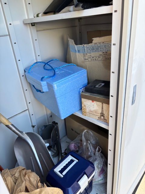 屋外物置には工具、発泡スチロール容器、段ボール、そして使用済みのバッテリーなどの産業廃棄物が混在。適正な許可をもつ処理業者と連携し、環境に配慮した回収方法で対応いたしました。