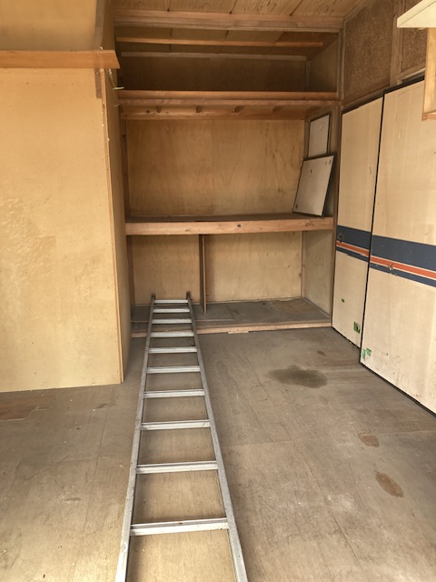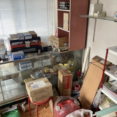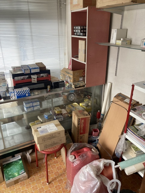 かつて営業に使用されていたスペースには、販売用の什器や在庫品がそのまま保管されており、まるで小さな倉庫のような状態。
