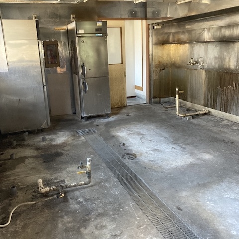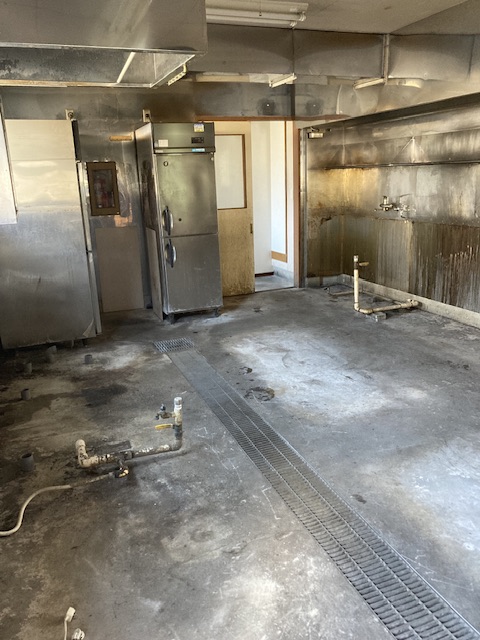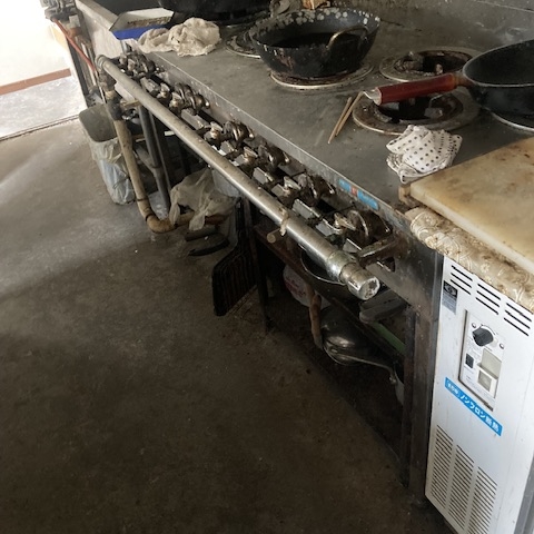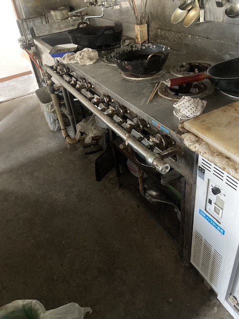 厨房スペースには業務用ガスコンロ、調理台、冷蔵庫などの大型機器が残されていました。