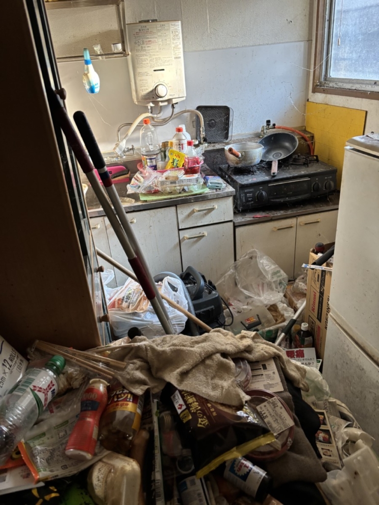 室内はゴミ屋敷化しており、特に約3畳のキッチンスペースは床一面が生活ゴミと腐敗した食べ物で覆われていました。