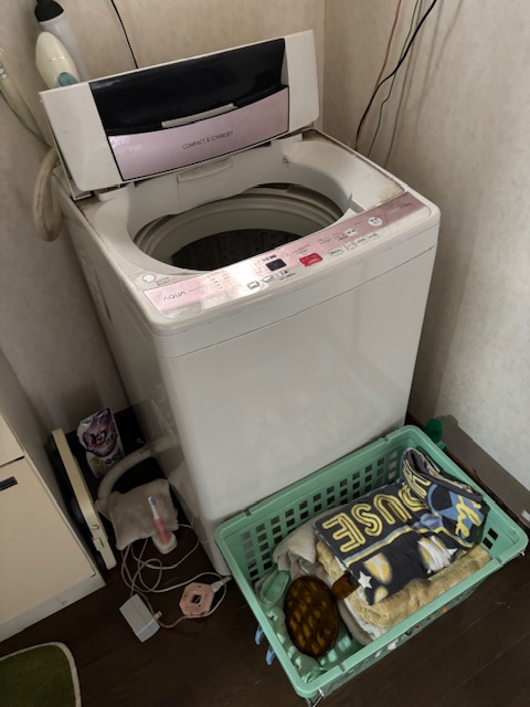 また、周辺に洗剤・洗濯用品・小物類が多く、排水ホース・電源コードが繋がったままで、専門的な取り外しが必要でした。