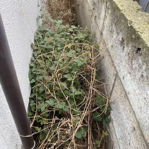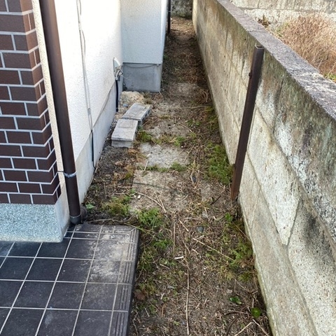 建物脇の狭い通路|機械が入らないため手作業で除草