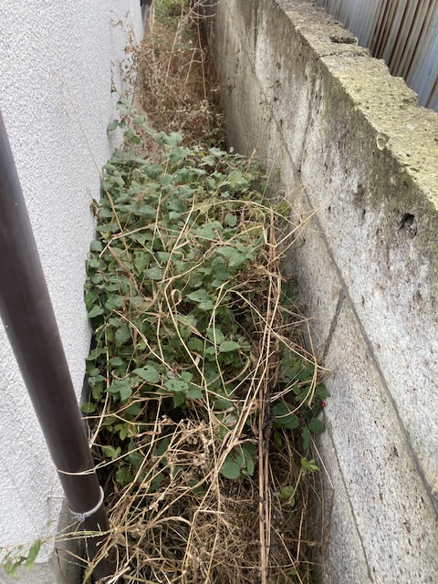 雑草・ツル性植物が絡み合い、完全に通路が塞がれていました。